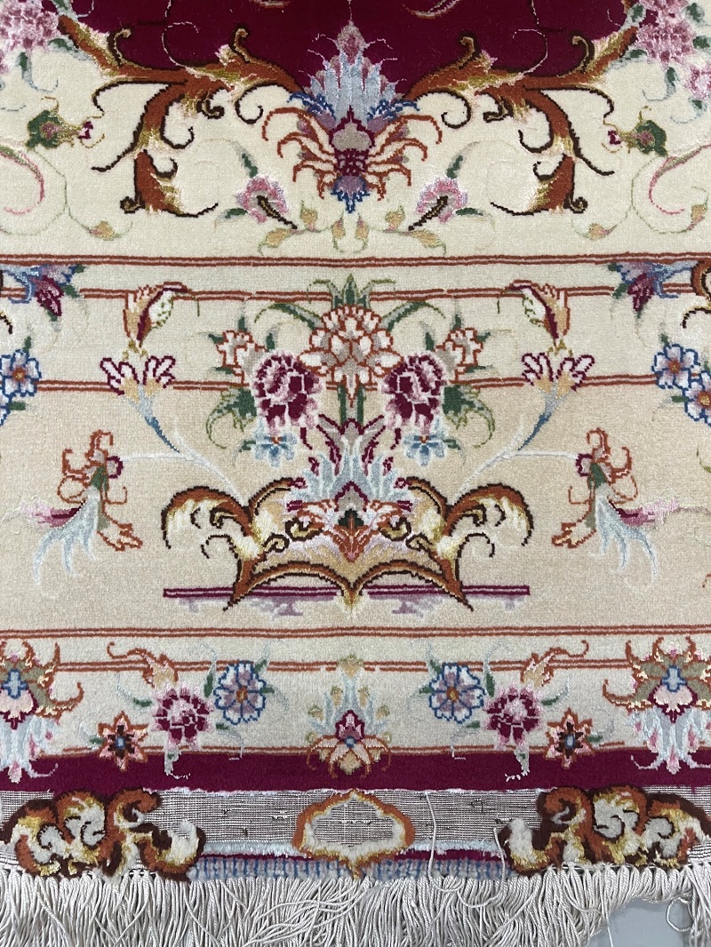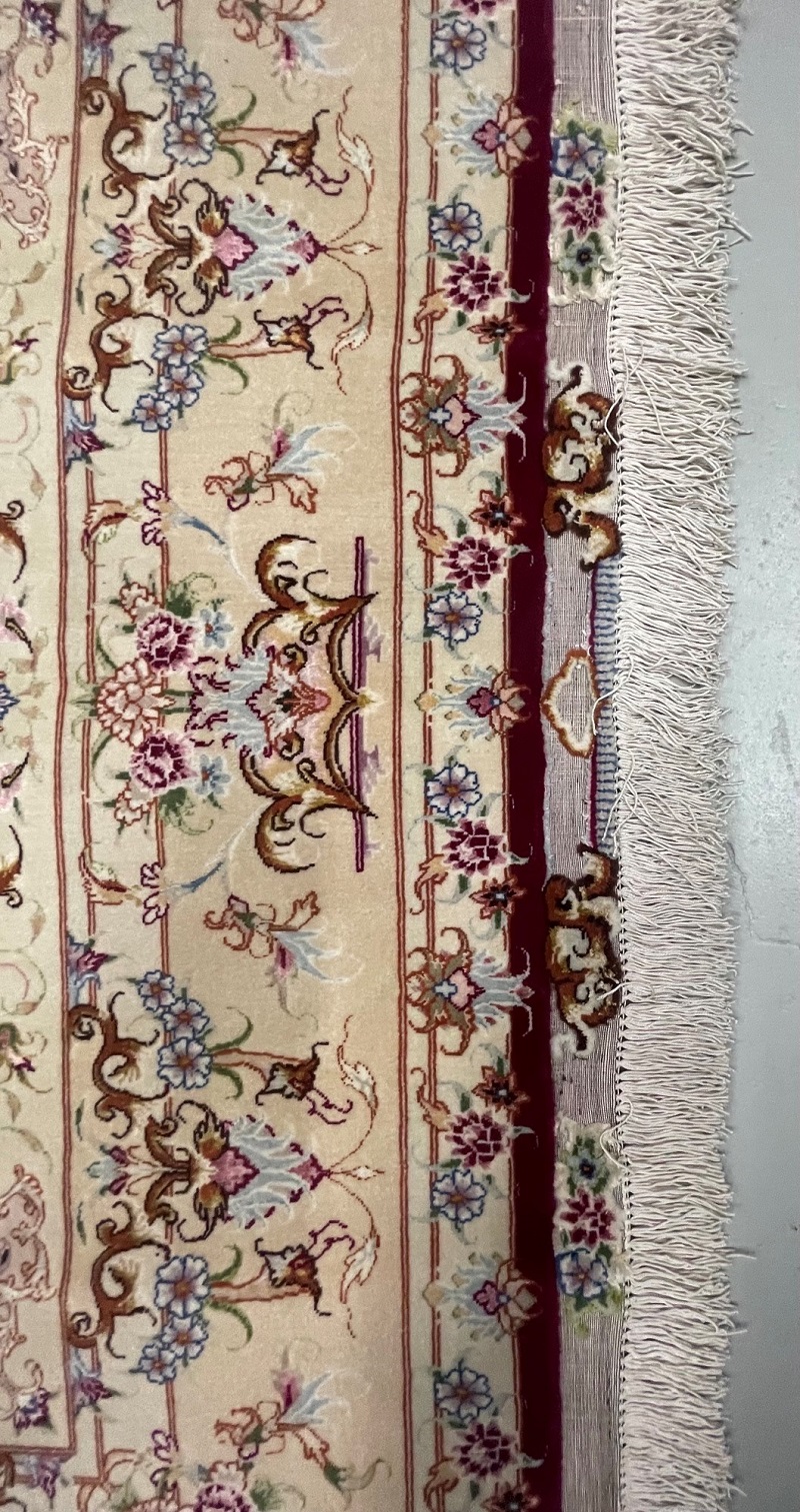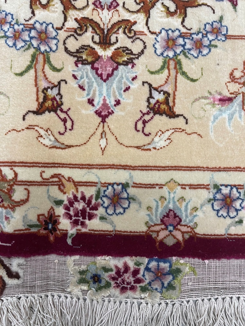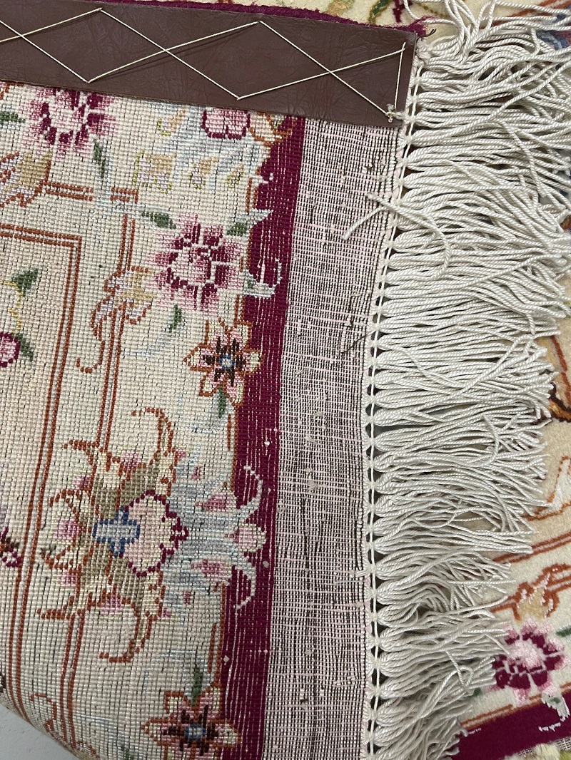 [description] => A silk base high quality rug with Aroos Baft (Klim Baft) on top and bottom borders. Rugs with Aroos Baft were special gifts for newlywed couples.
