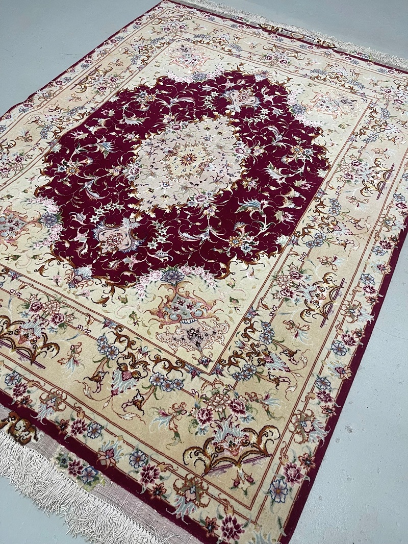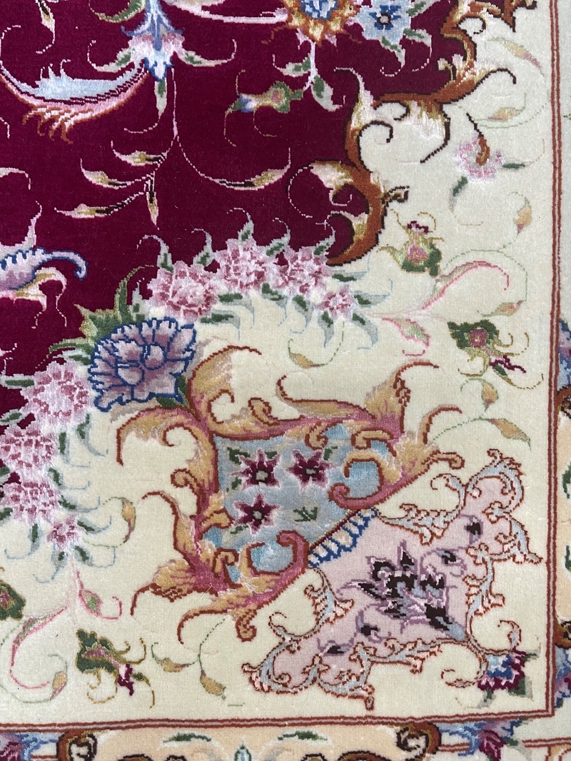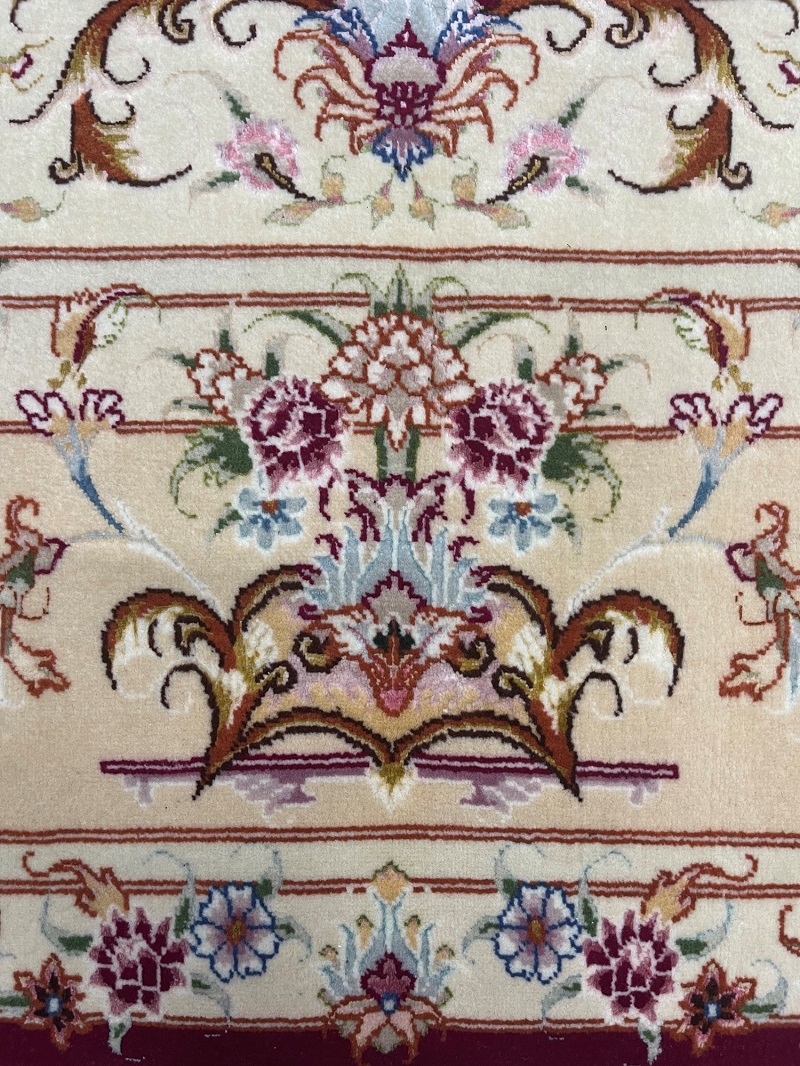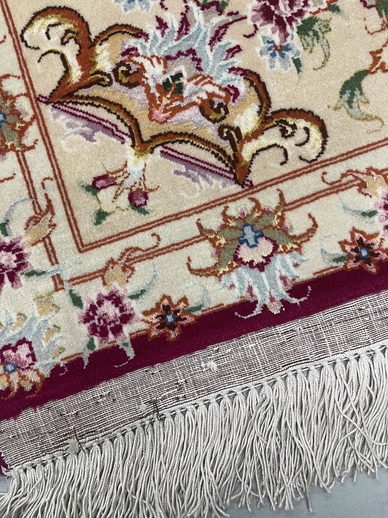 [description] => A silk base high quality rug with Aroos Baft (Klim Baft) on top and bottom borders. Rugs with Aroos Baft were special gifts for newlywed couples.