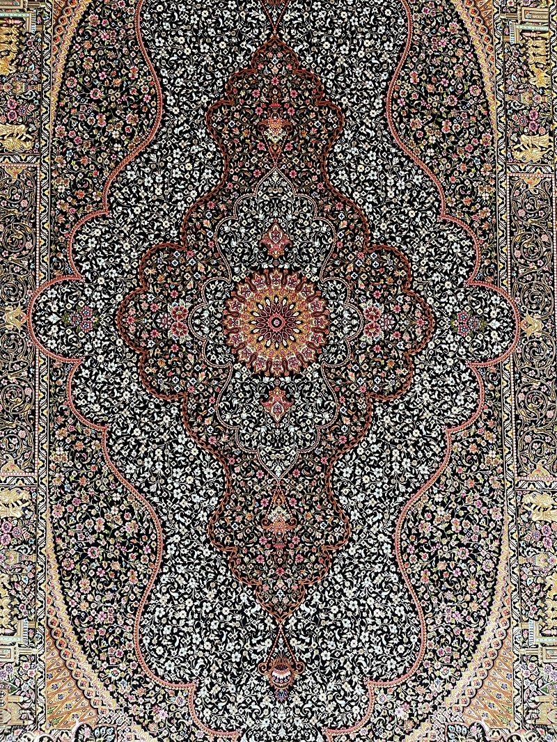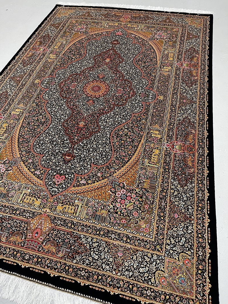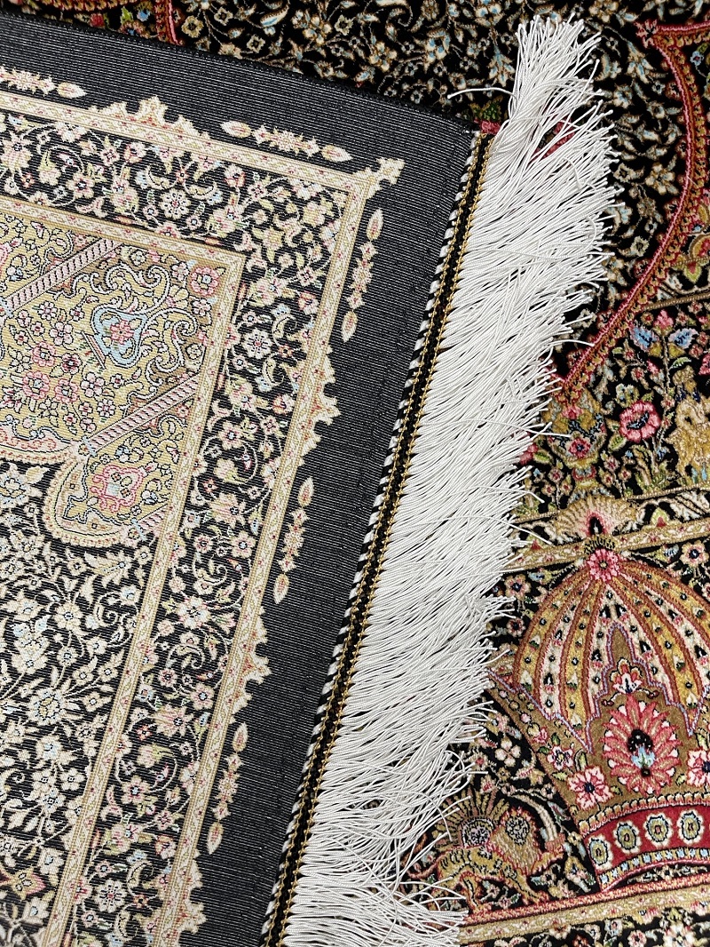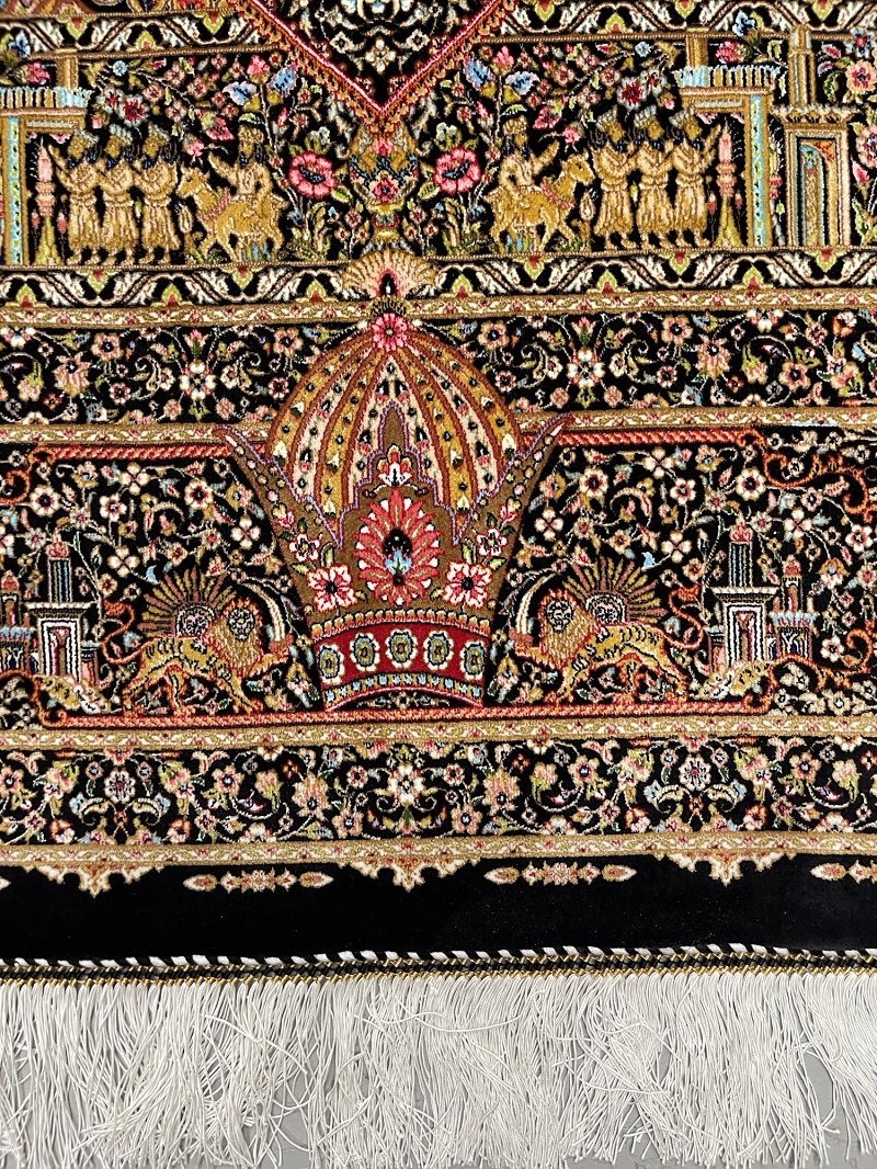 Beautiful multi-color Persian royal design, very soft, brings a luxury addition to your place. Design representing the ancient empire of Persia including the crown and army, and palaces. Rug is made using a combination of hand and special machine with advanced tufting and knotting techniques which creates high density, ultra soft, and comfortable pile. Fringes and final touches done by hand. The material used are premium viscose, Bamboo wood yarn, and acrylic which makes the rug much more durable and resistance to stains. With such an affordable price, the quality, and look and feel of the rug is truly comparable with fully handmade much more expensive Persian silk rug.