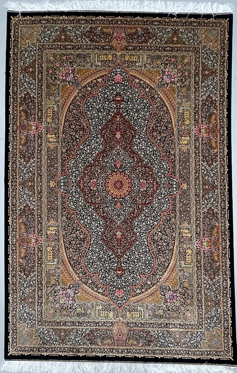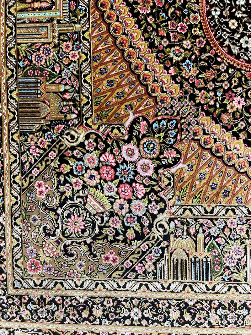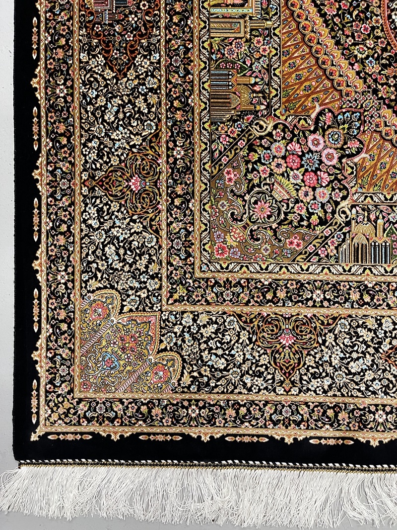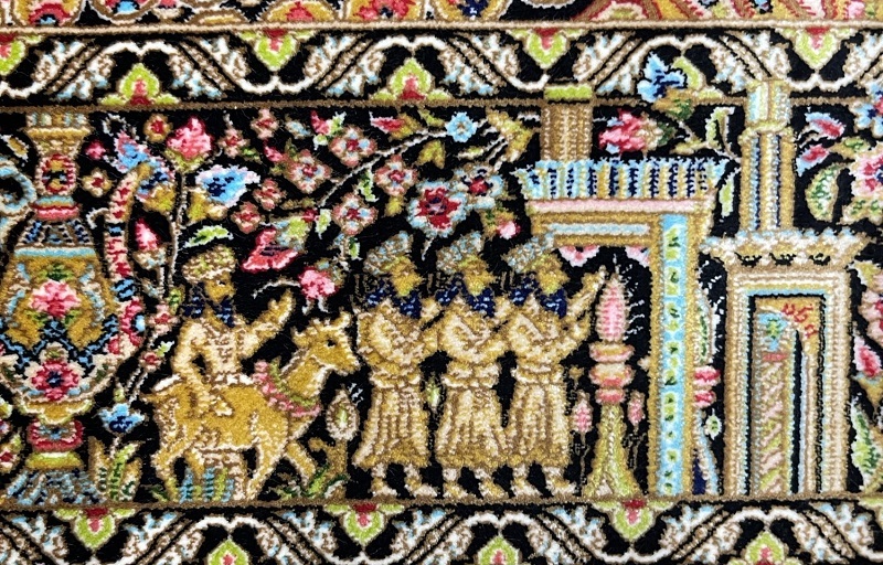 Beautiful multi-color Persian royal design, very soft, brings a luxury addition to your place. Design representing the ancient empire of Persia including the crown and army, and palaces. Rug is made using a combination of hand and special machine with advanced tufting and knotting techniques which creates high density, ultra soft, and comfortable pile. Fringes and final touches done by hand. The material used are premium viscose, Bamboo wood yarn, and acrylic which makes the rug much more durable and resistance to stains. With such an affordable price, the quality, and look and feel of the rug is truly comparable with fully handmade much more expensive Persian silk rug.