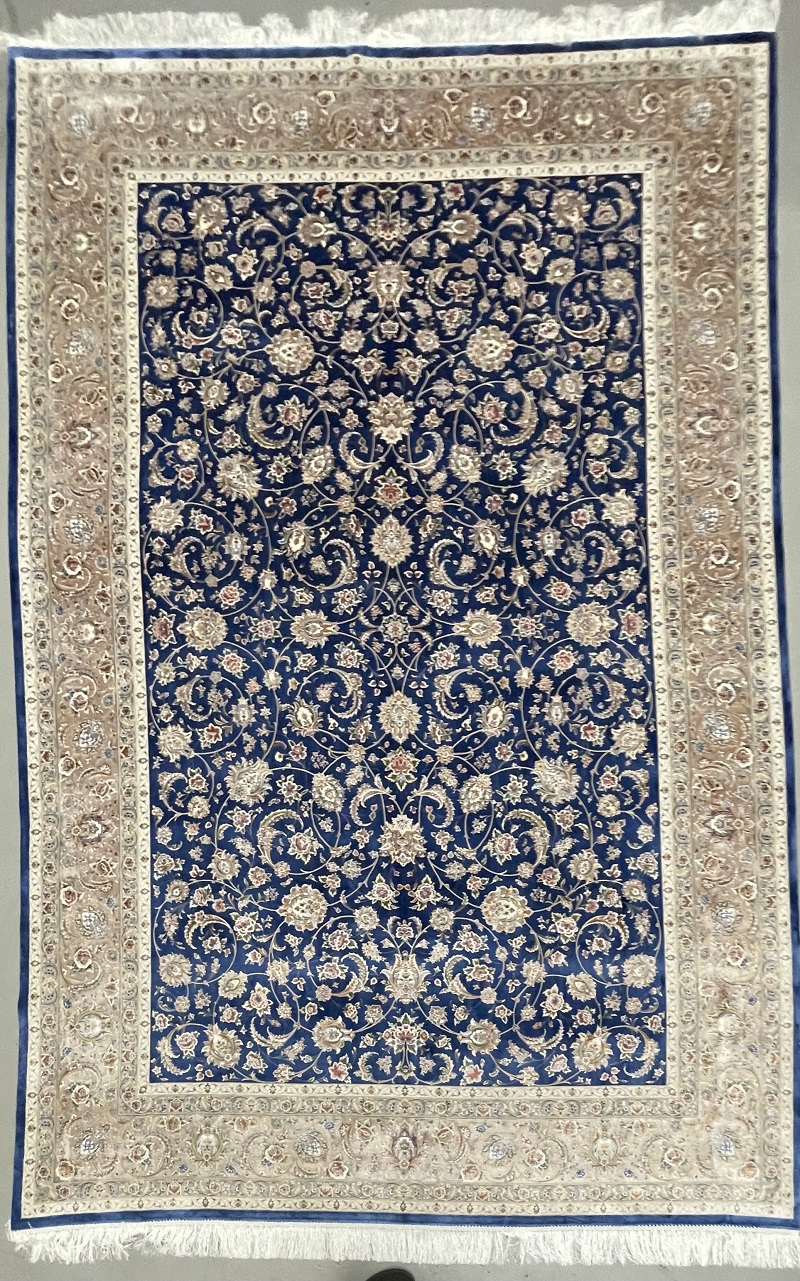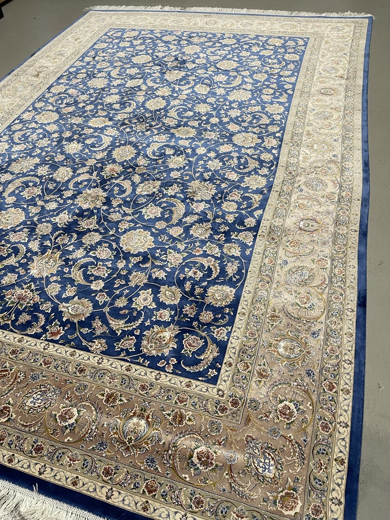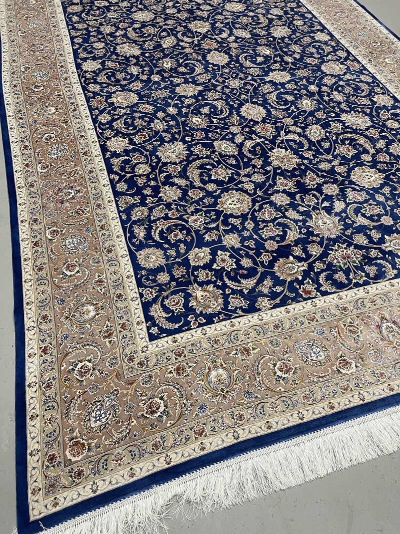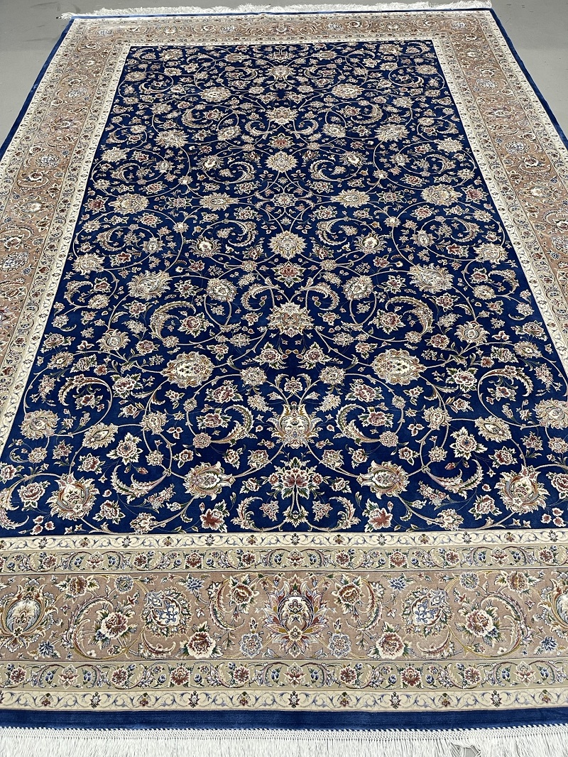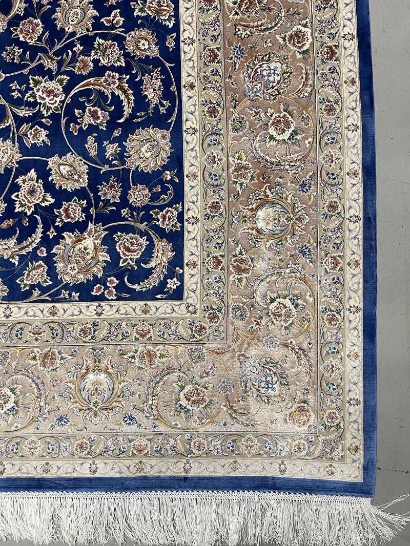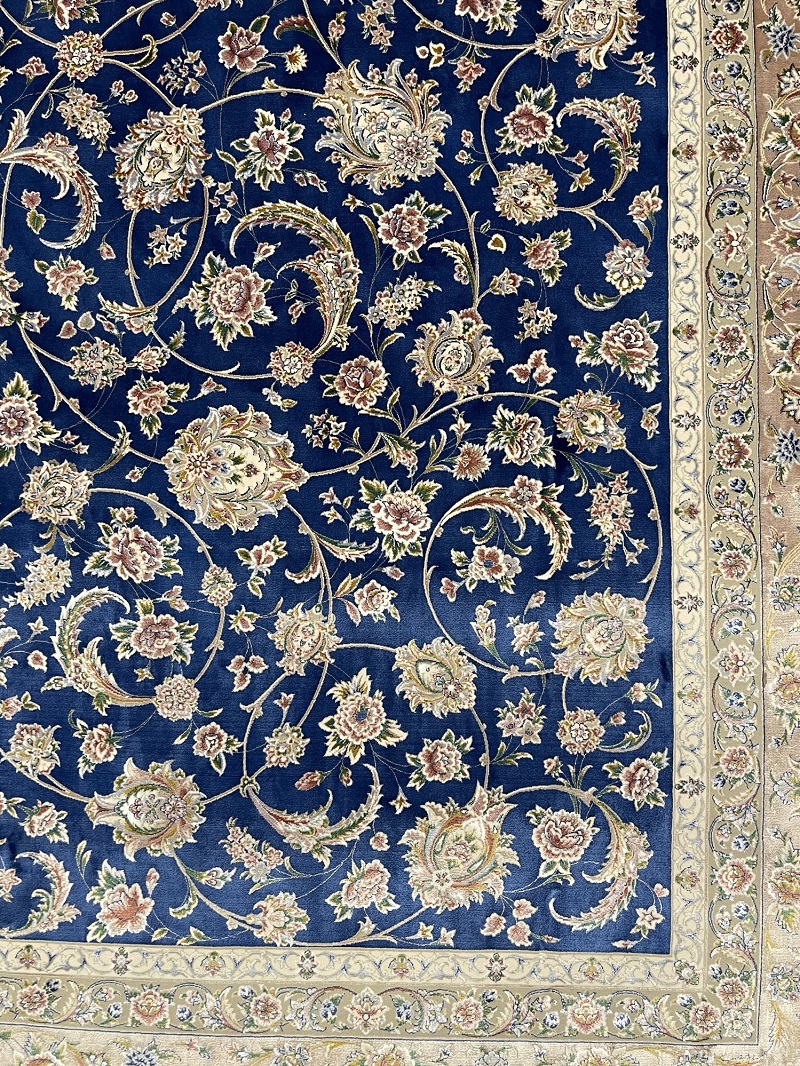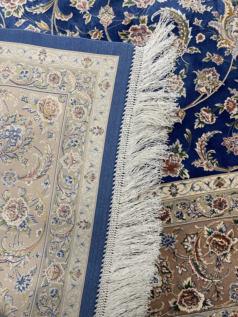 Beautiful blue Persian overall design, very soft, brings a luxury addition to your place. Rug is made using a combination of hand and special machine with advanced tufting and knotting techniques which creates high density, ultra soft, and comfortable pile. Fringes and final touches done by hand. The material used are premium viscose, Bamboo wood yarn, and acrylic which makes the rug much more durable and resistance to stains. With such an affordable price, the quality, and look and feel of the rug is truly comparable with fully handmade much more expensive Persian silk rug.