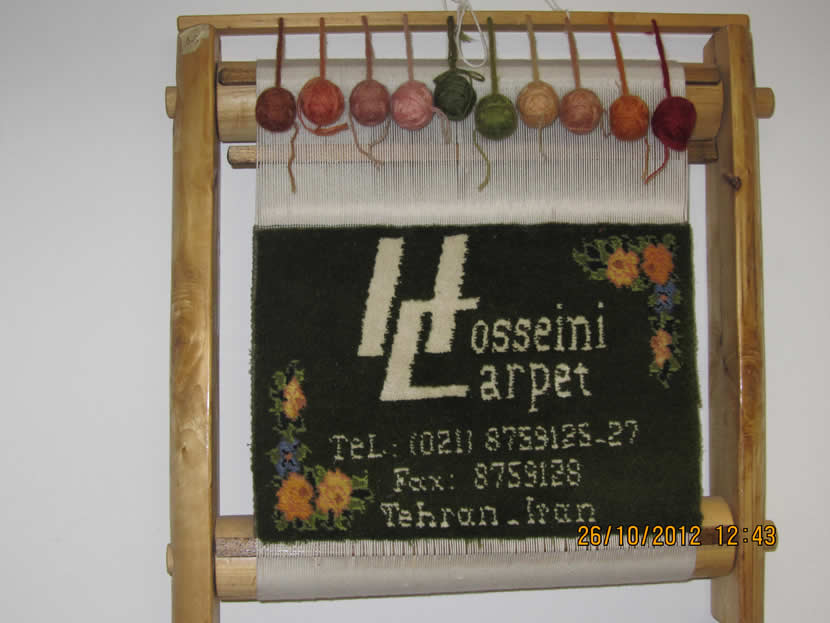 Description: Wooden frame border - one of our sample hand-woven Hosseini Carpet logo rugs. Custom design ordered by our family. We accept similar custom orders for logos, special occasions, ... Some other samples are in our