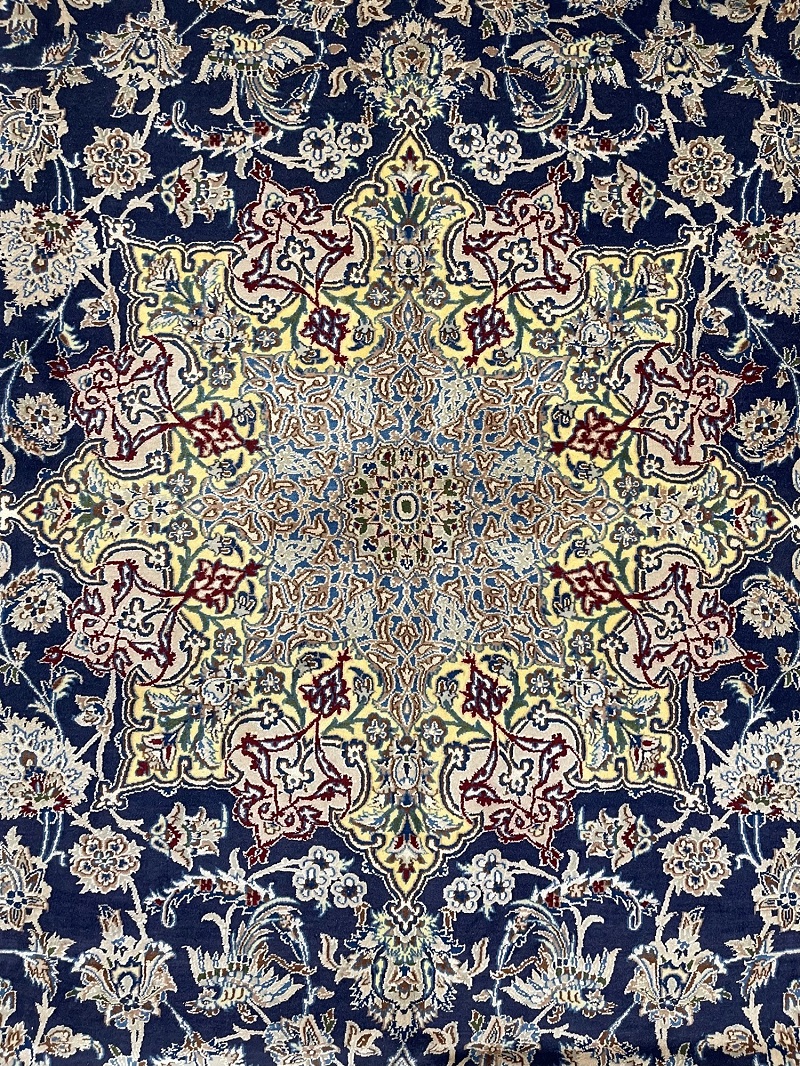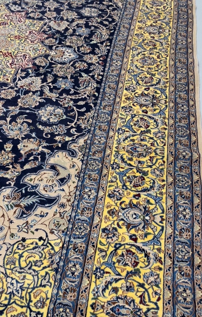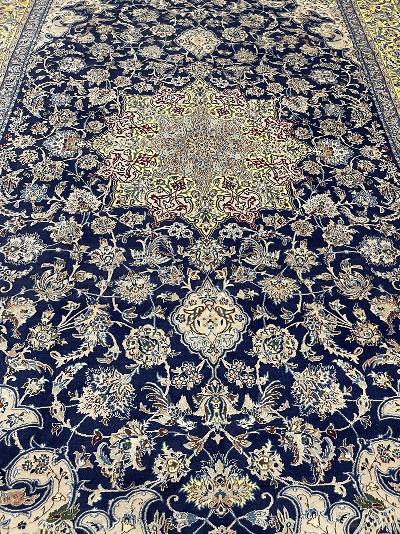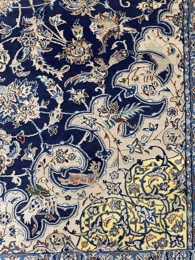 Description: High quality Nain (Isfahan) rug known as 6 La (yarn). Beautiful combination of Dark Blue and special Yellow colors.