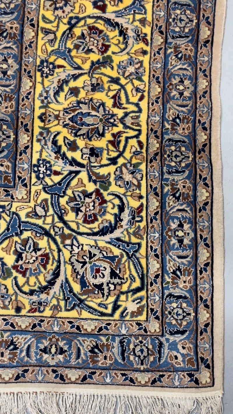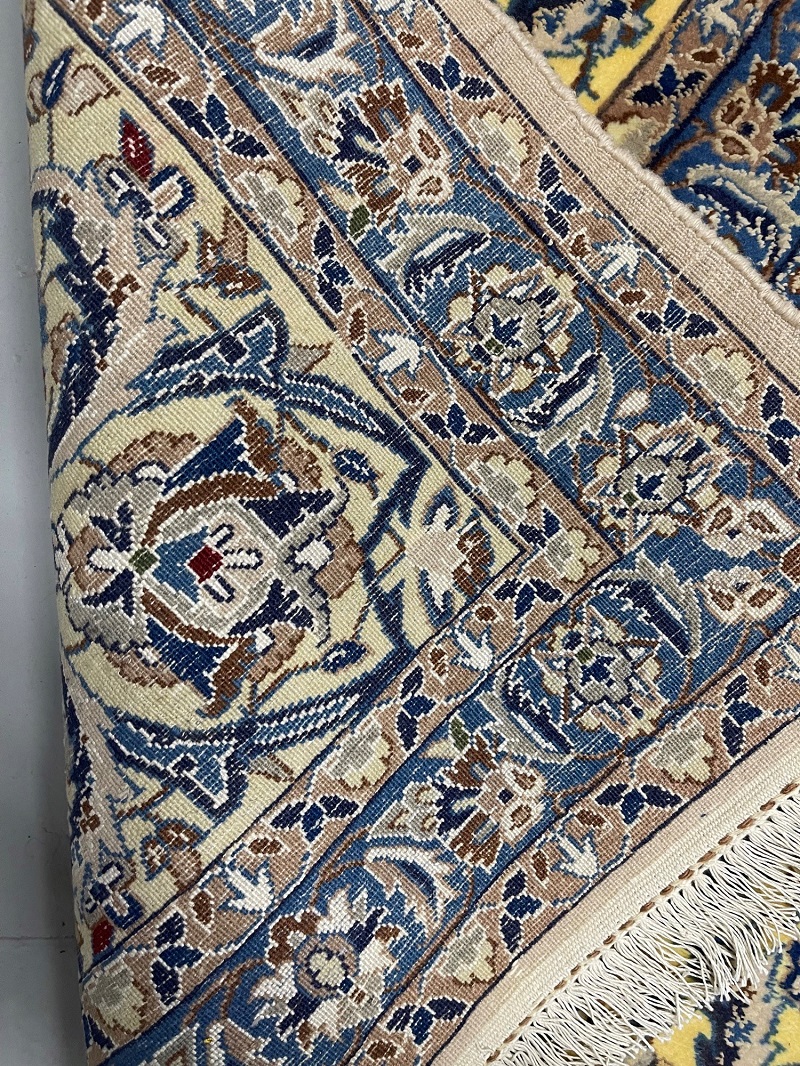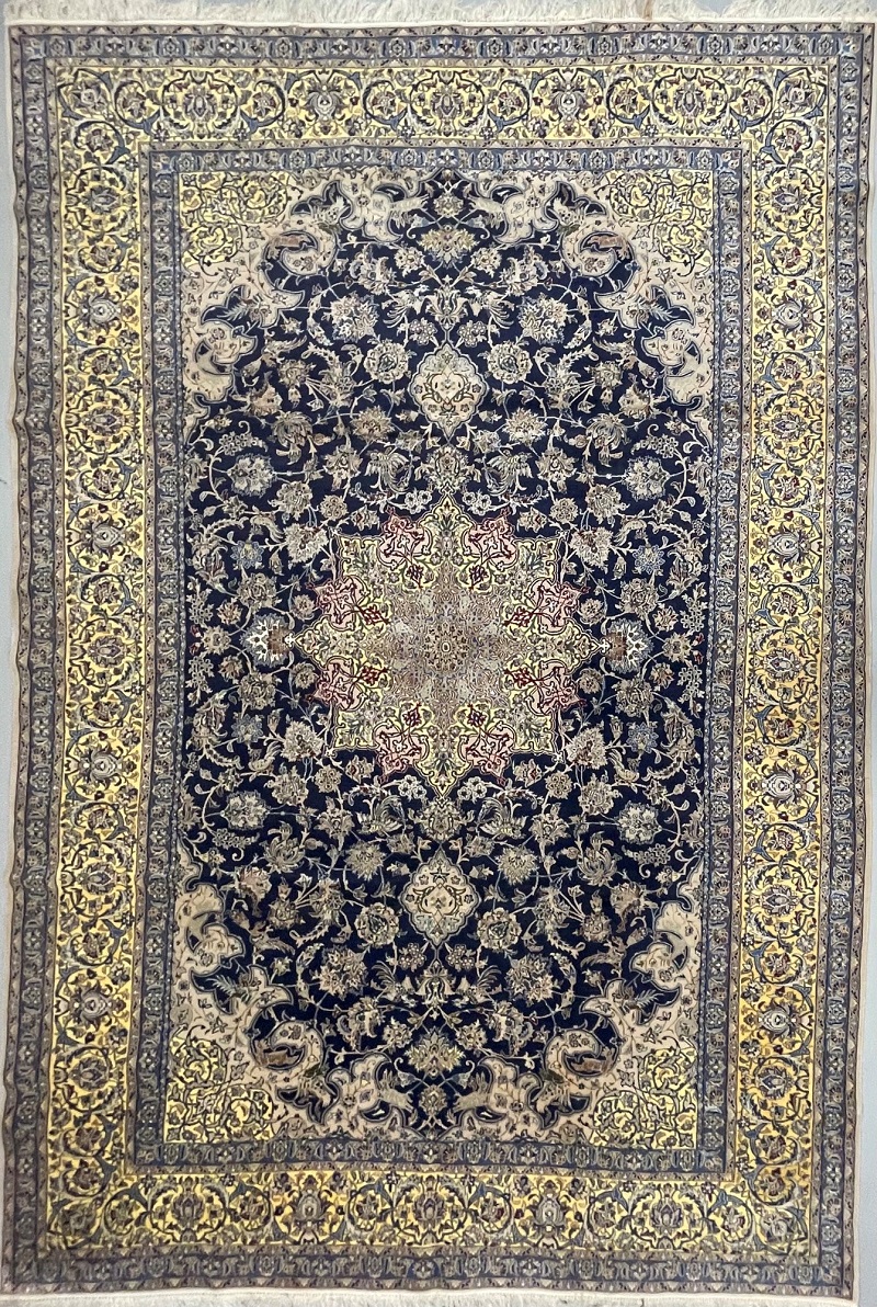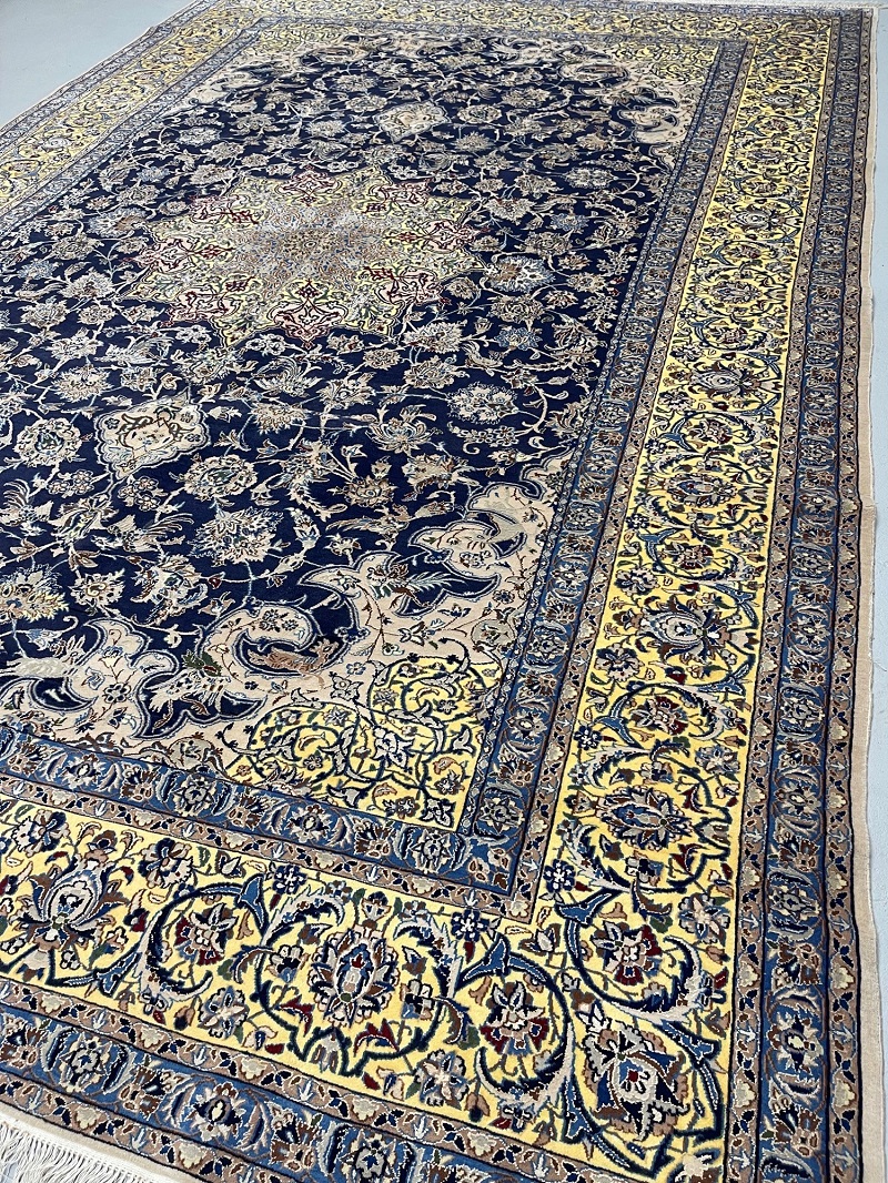 Description: High quality Nain (Isfahan) rug known as 6 La (yarn). Beautiful combination of Dark Blue and special Yellow colors.
