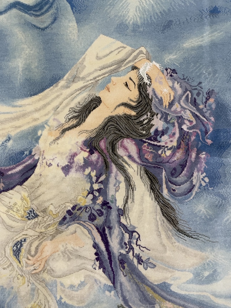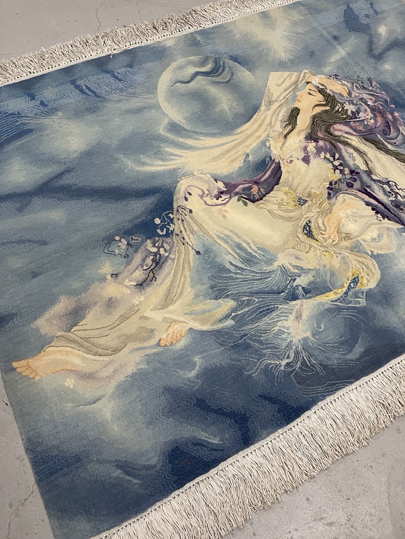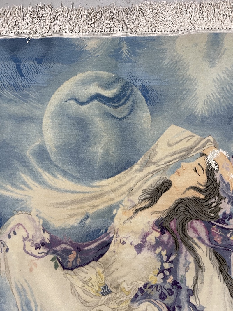 Description: A real mix of art and hand weaving on a tableau silk rug by master Farshchian from city of Tabriz.