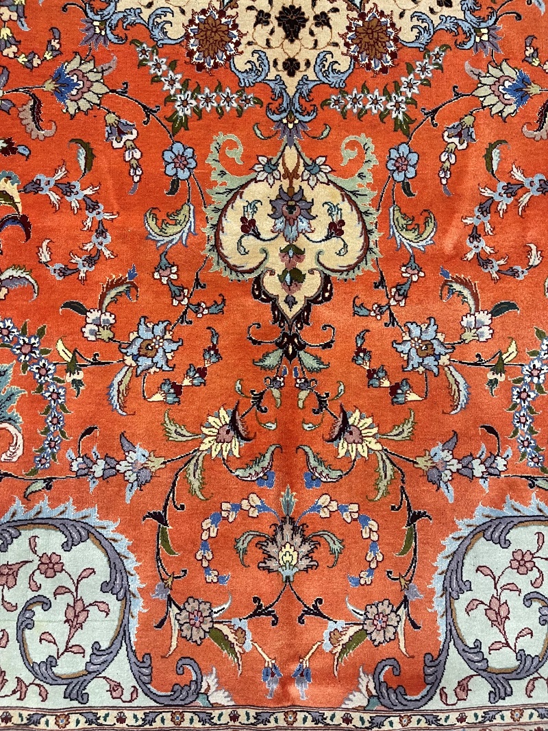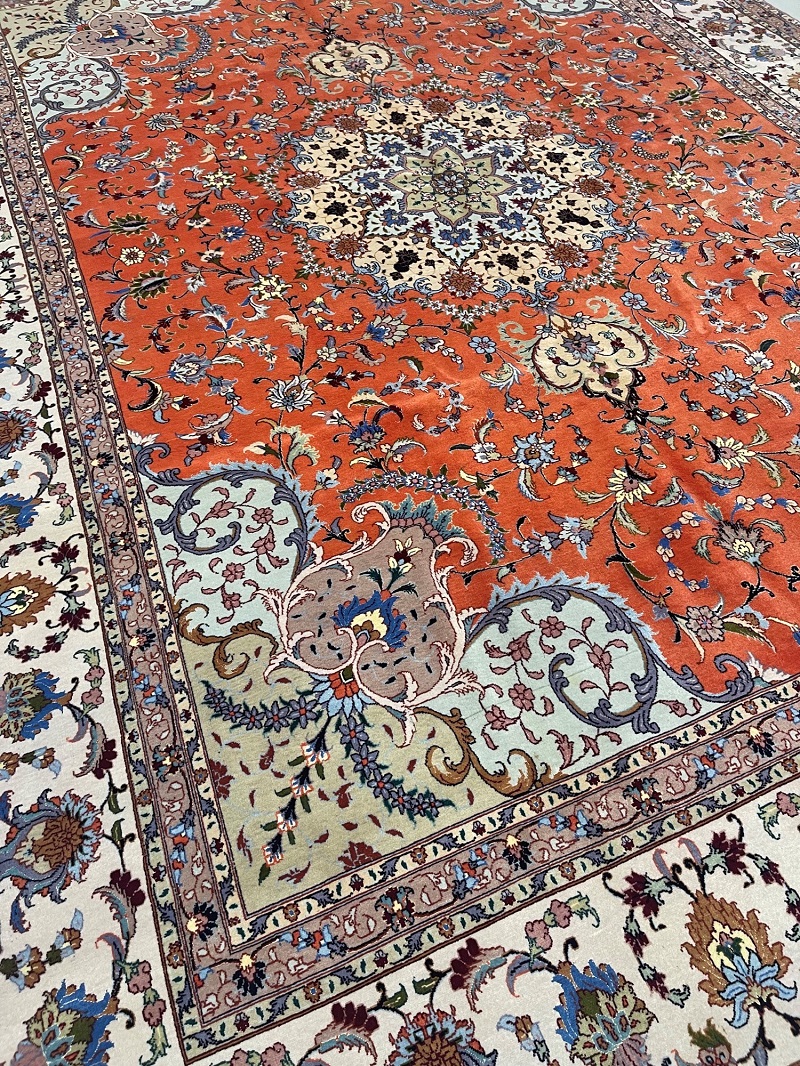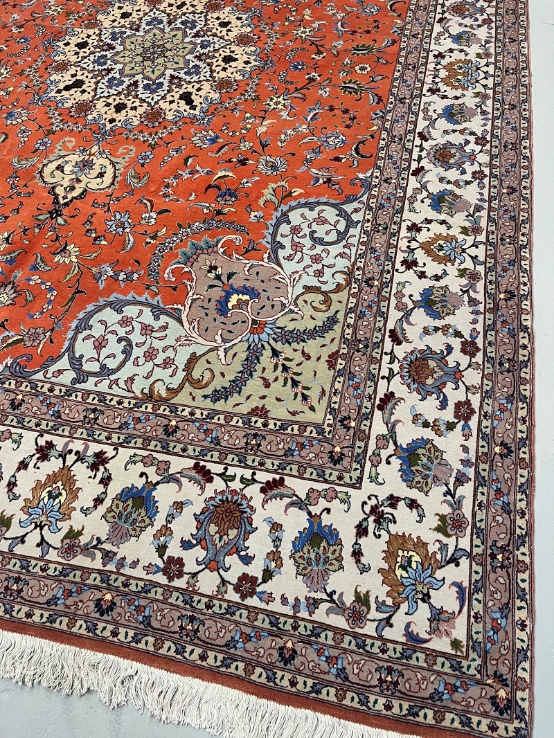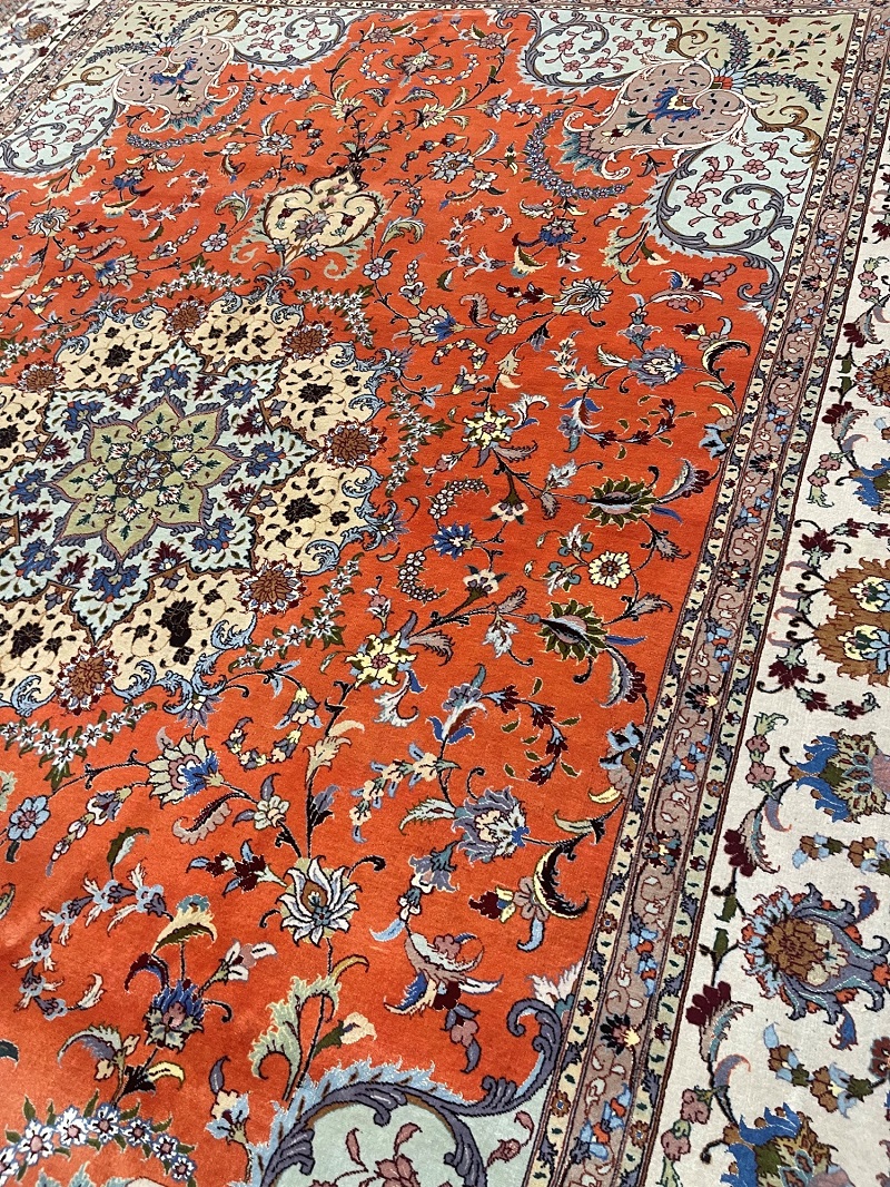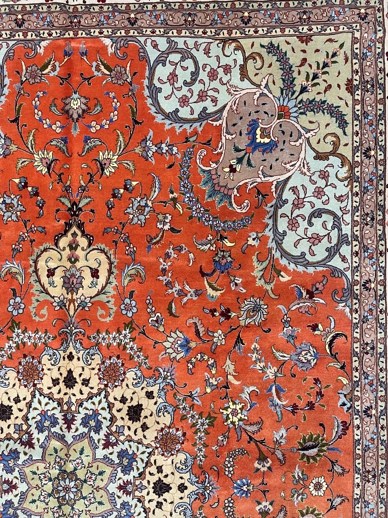 Description: Silk and wool original Persian hand-knotted rug from Tabriz, one of the most famous cities in Iran in high-end rug weaving industry.