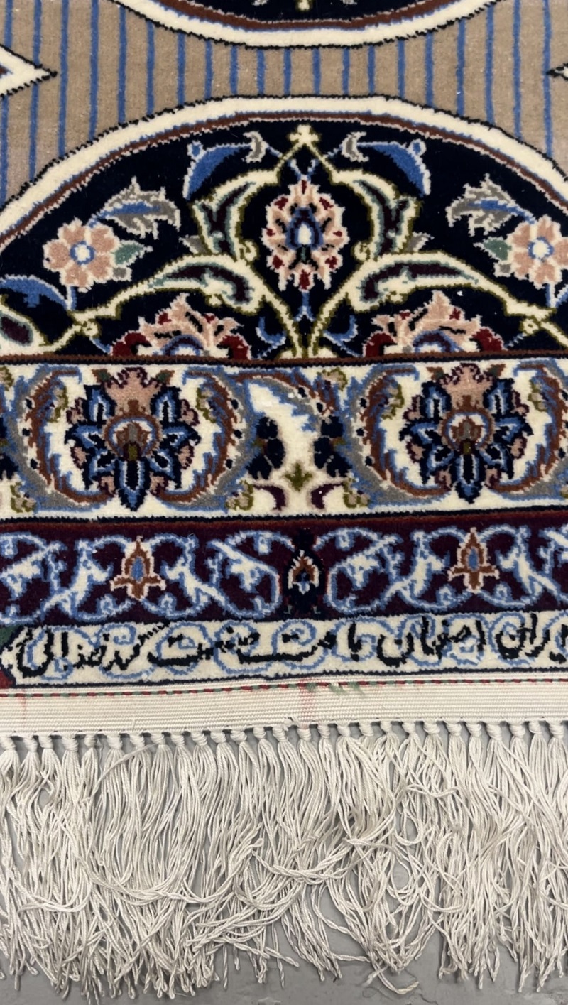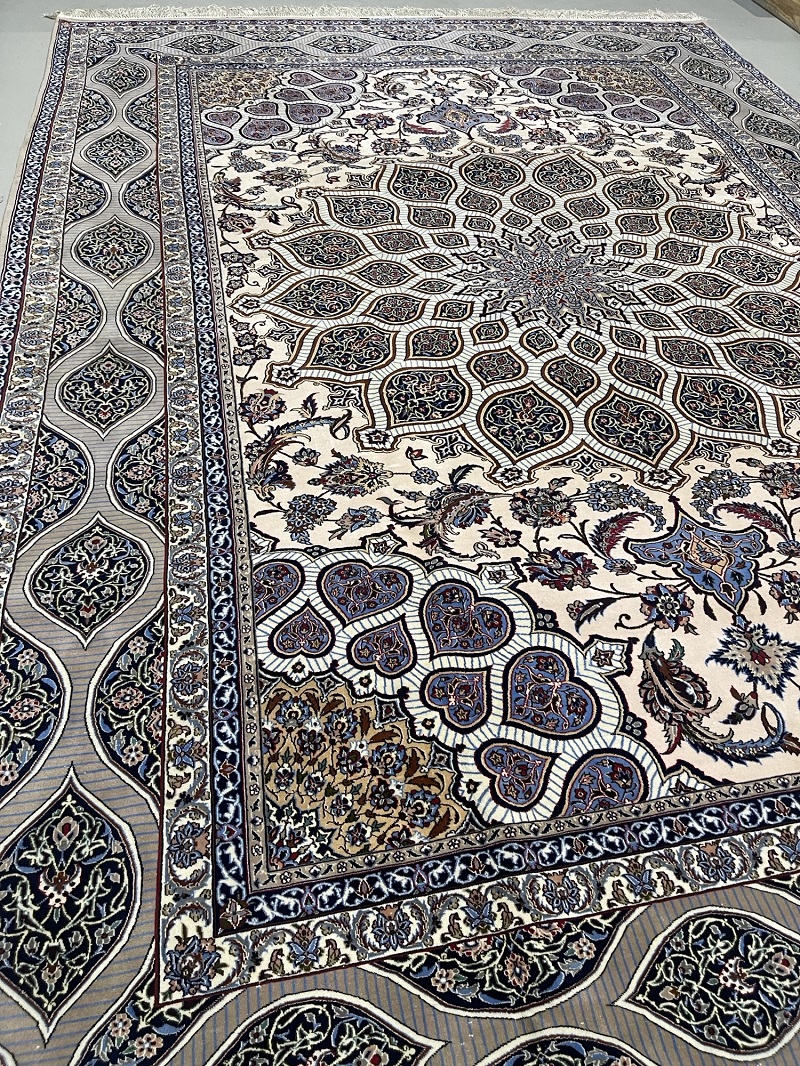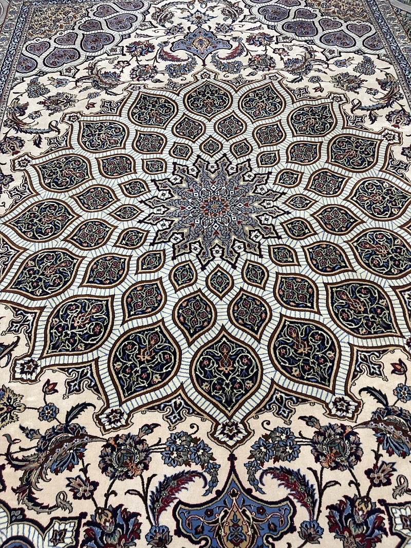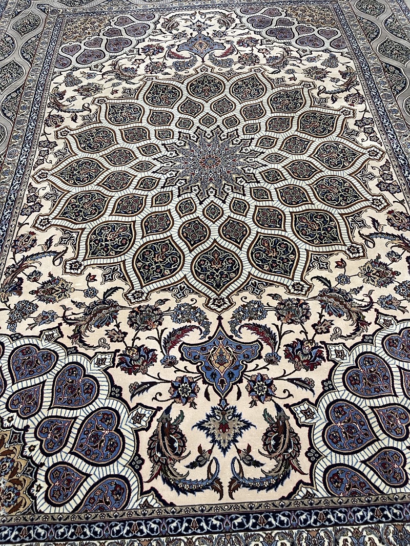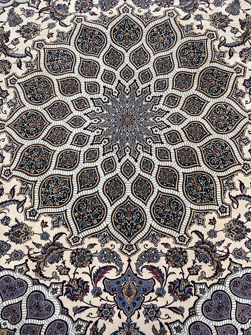Description: Very exceptional rug. Special order by our business Royalty Persian Rugs. Manufactured and signed by Master Kadkhodaie (Sign is in one of photos). A unique design inspired by the dome design of a famous mosque in Isfahan (Iran) Masjed Shah (Shah Mosque). Design is a complete dome mirroring the ceiling of mosque. Colors are all natural and very specific to Isfahan rugs. The design around medallions is known as King Abbas-e one of the Iranian kings of the past. Border of the rugs has the same design as the main design which is an exception in rug design.