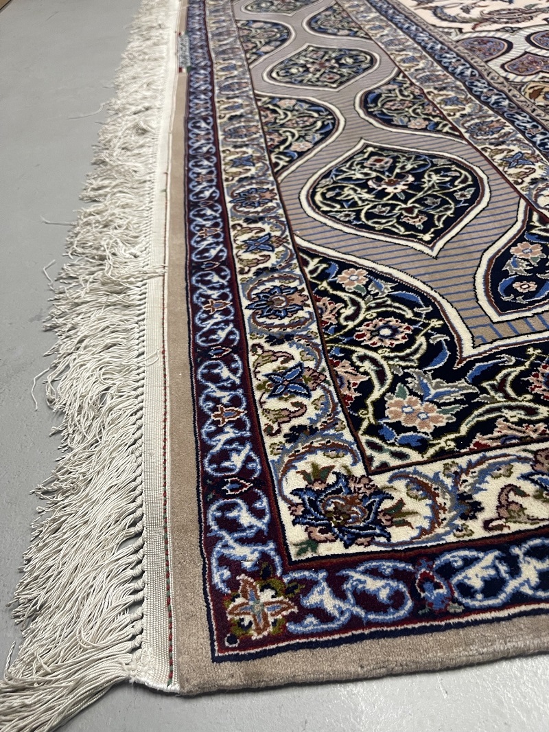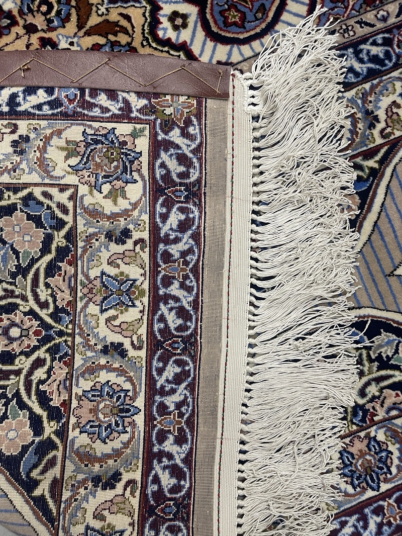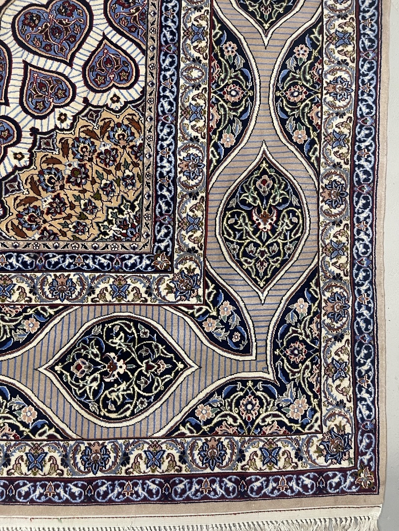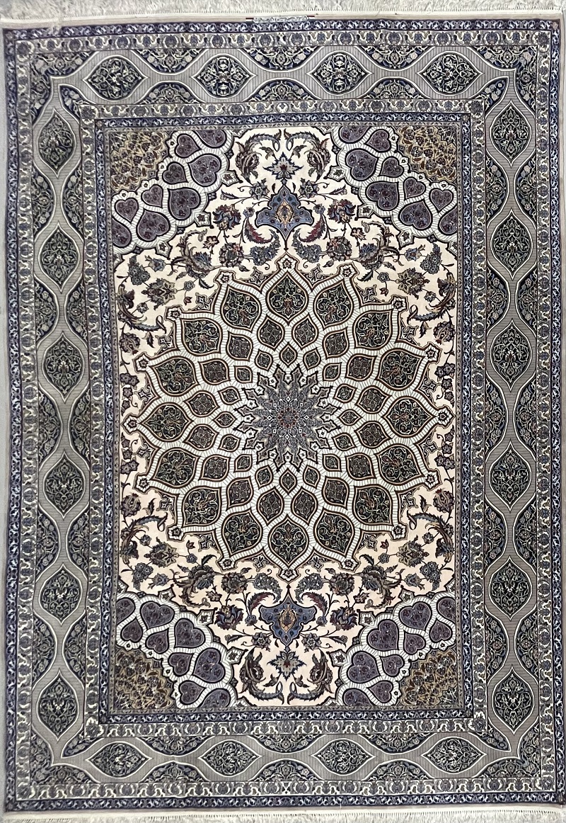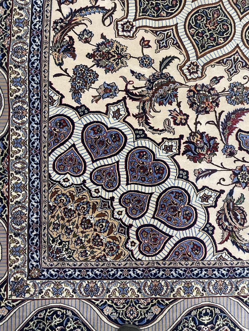 Description: Very exceptional rug. Special order by our business Royalty Persian Rugs. Manufactured and signed by Master Kadkhodaie (Sign is in one of photos). A unique design inspired by the dome design of a famous mosque in Isfahan (Iran) Masjed Shah (Shah Mosque). Design is a complete dome mirroring the ceiling of mosque. Colors are all natural and very specific to Isfahan rugs. The design around medallions is known as King Abbas-e one of the Iranian kings of the past. Border of the rugs has the same design as the main design which is an exception in rug design.