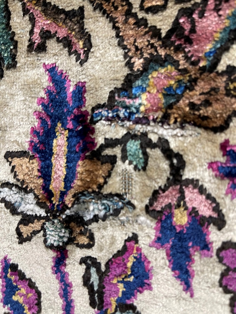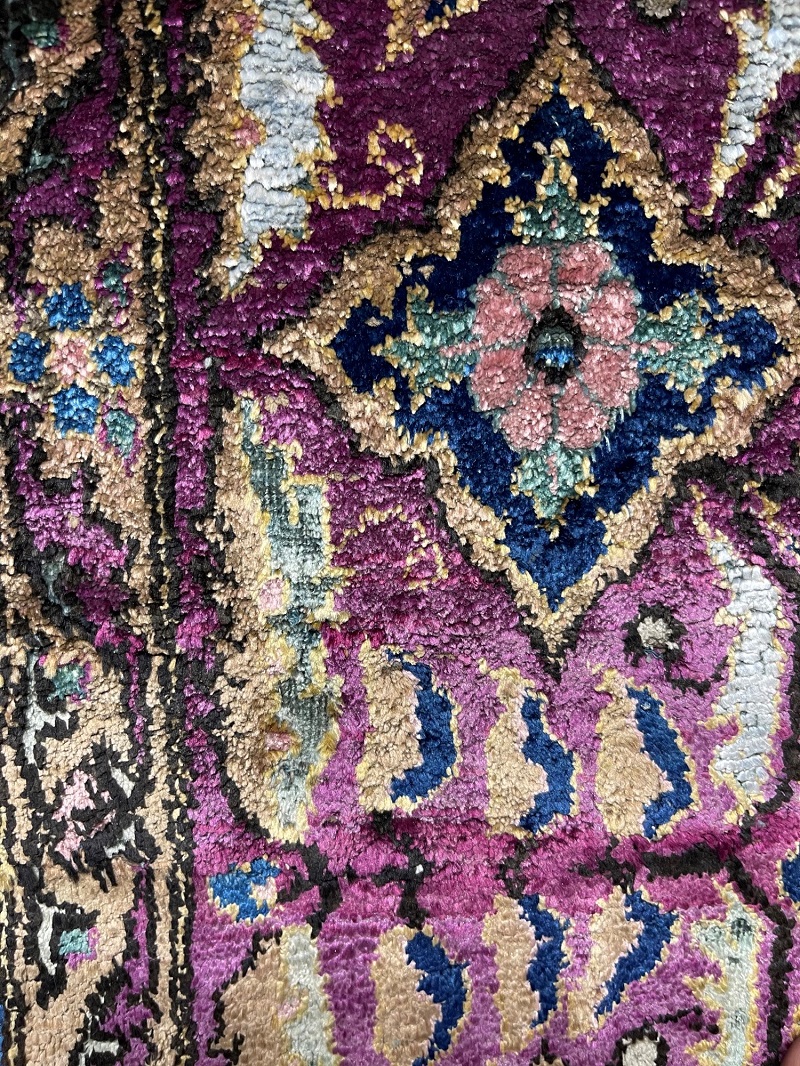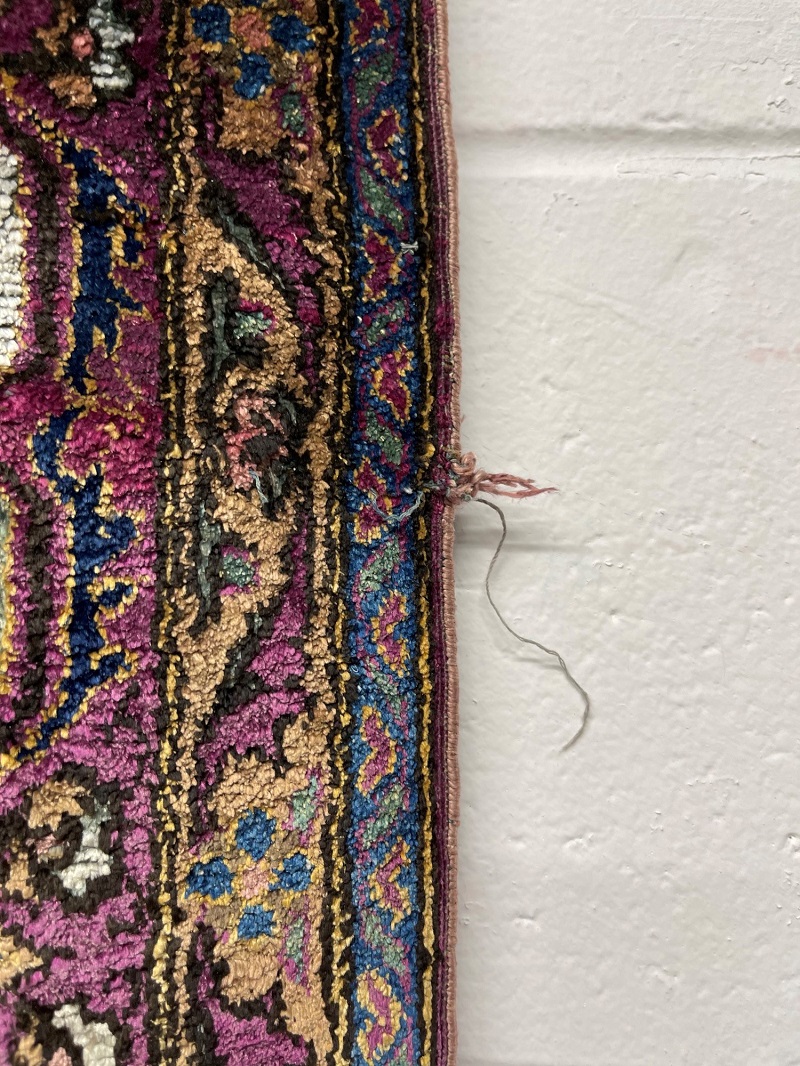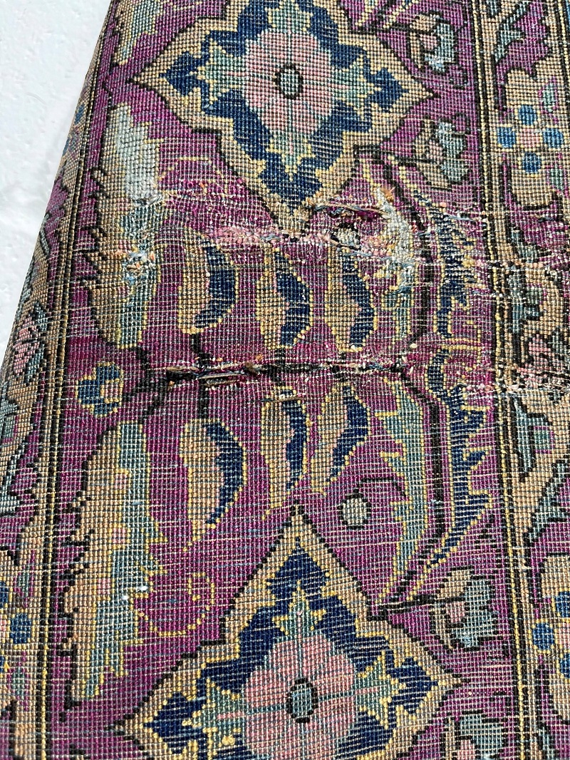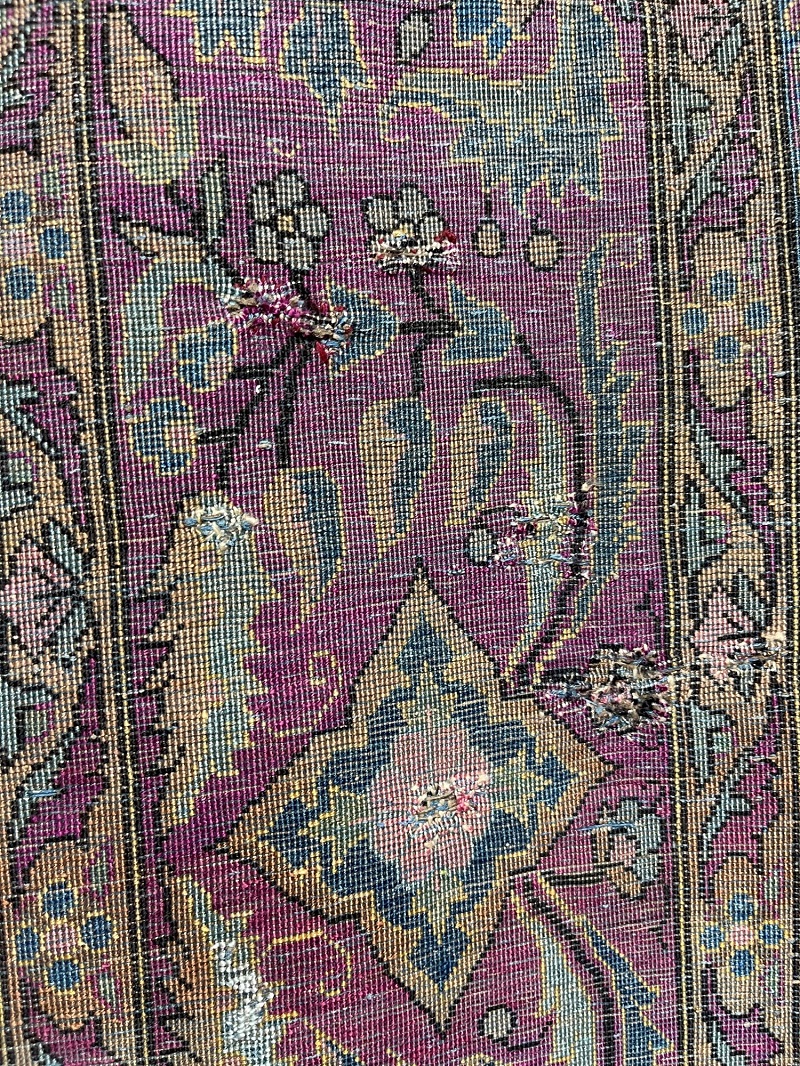 Rug has various sections with fixes, reconstructed, or left untouched which is normal for more than 100 years old rug.
