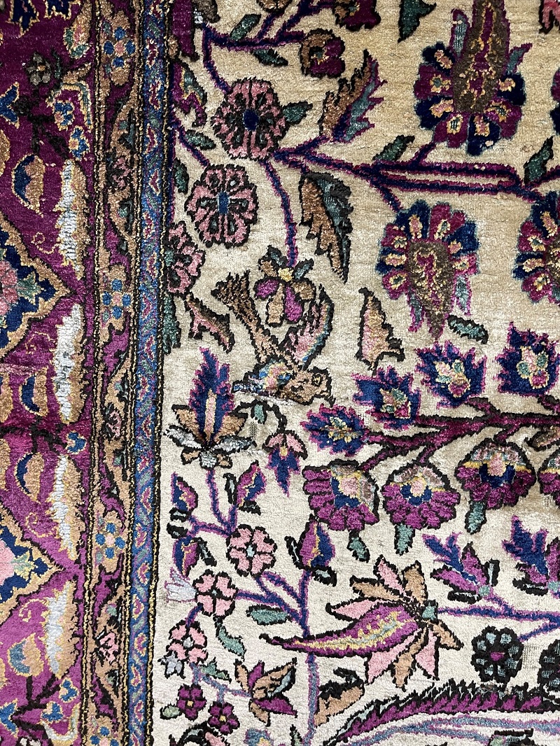 This rug has been carefully examined by some top experts in Persian rug in Tehran Grand Bazaar. They verified and confirmed that the rug is at least 100 years old.