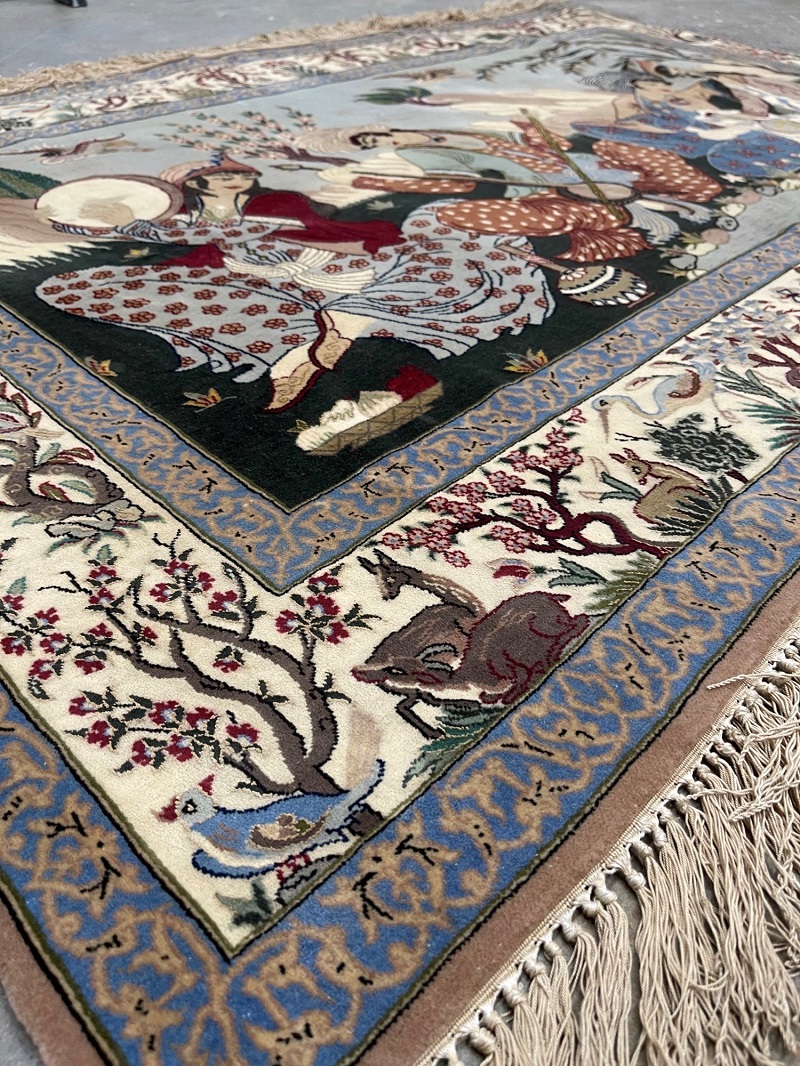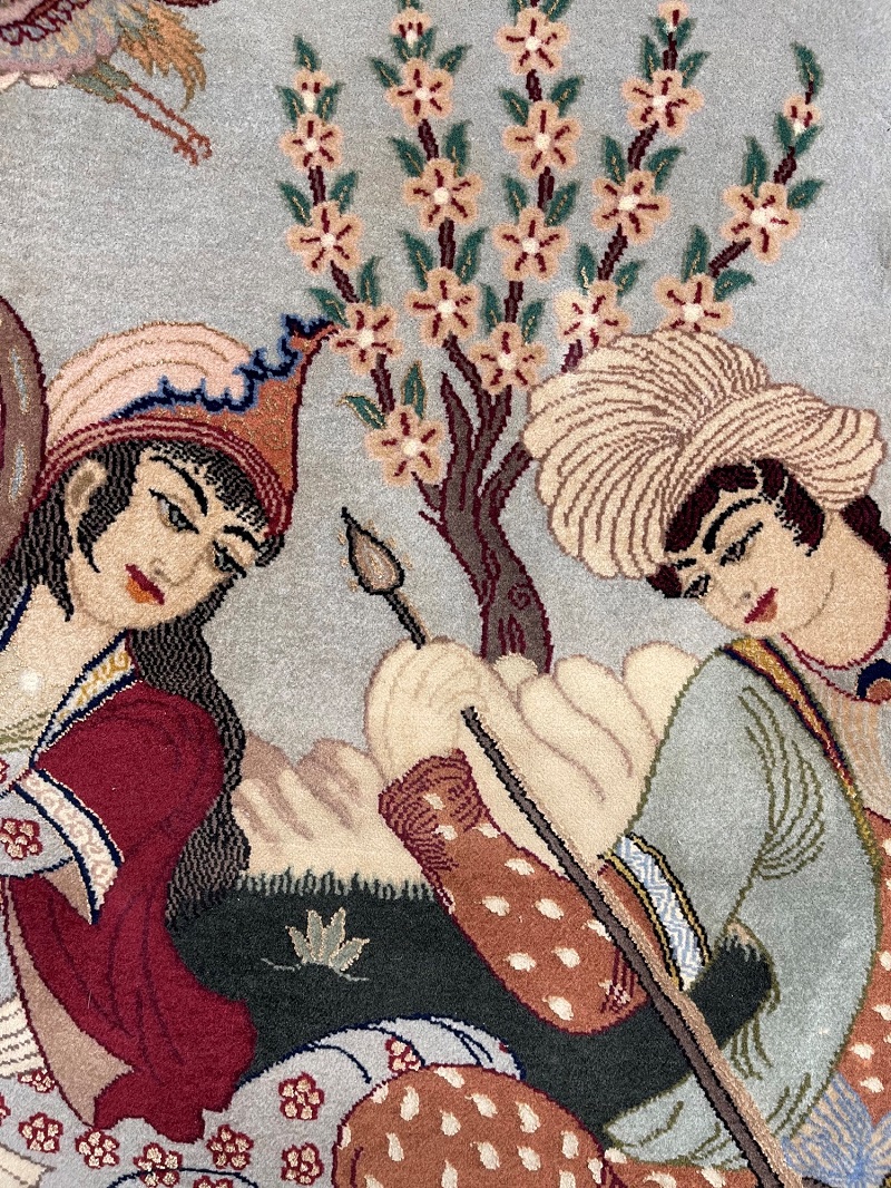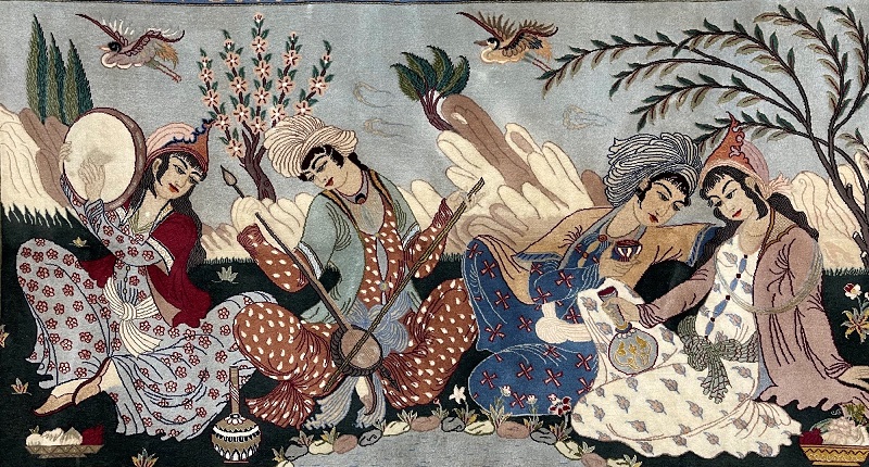 A brilliant piece of art representing traditional Persian party in nature with birds, flowers, trees, and popular music instruments like Persian Tar and Daf (Frame Drum).