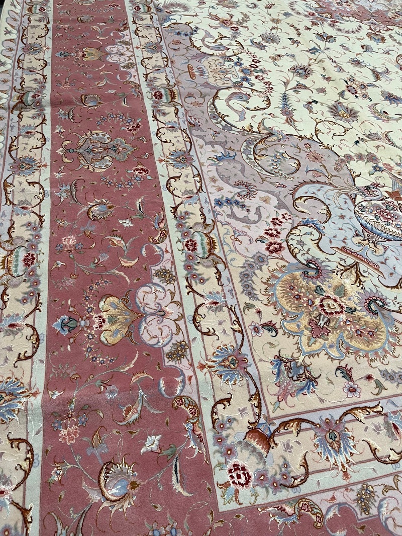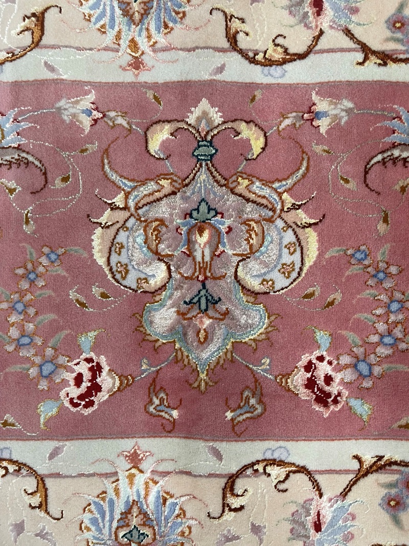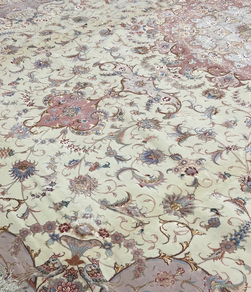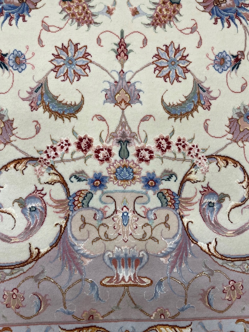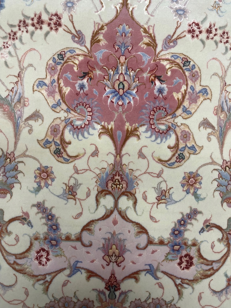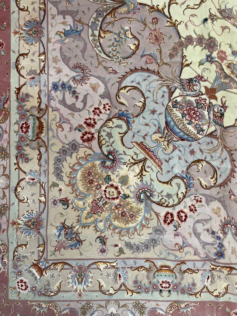 Designed and signed by Master Olia a well-known weaver in Tabriz and Iran. Wool used in rug is Merinos one of the best quality in the world. Silk has a combination of more than 70 colors.