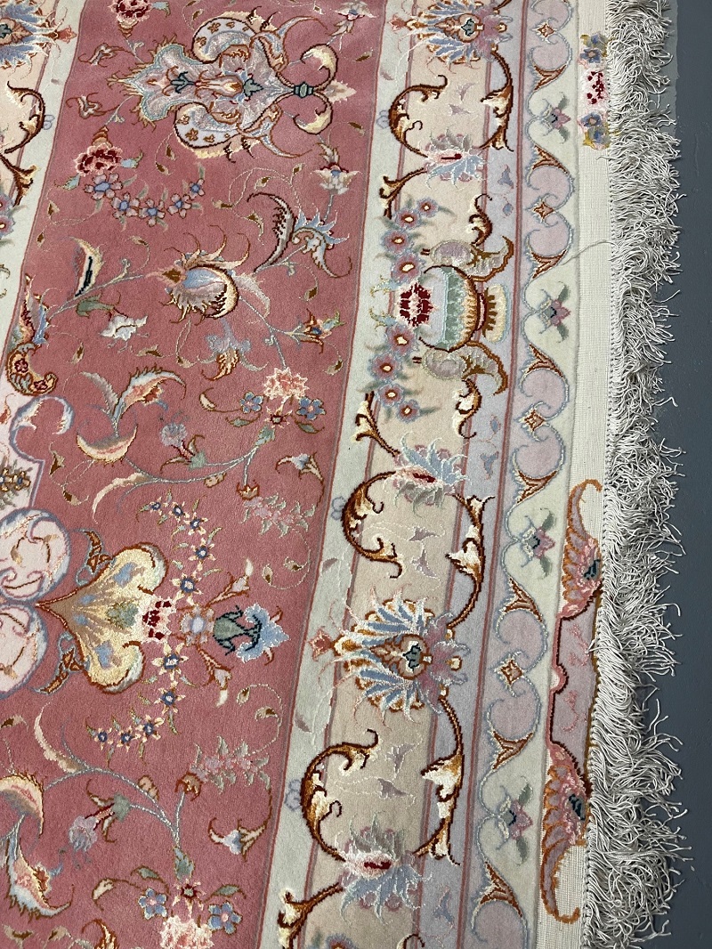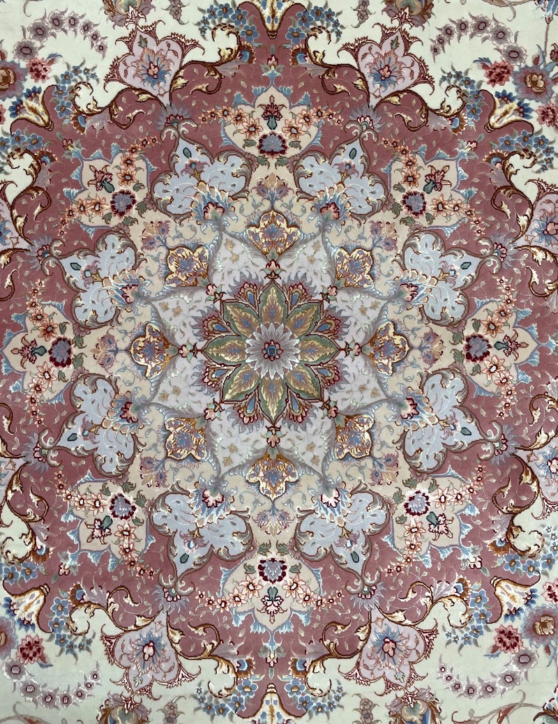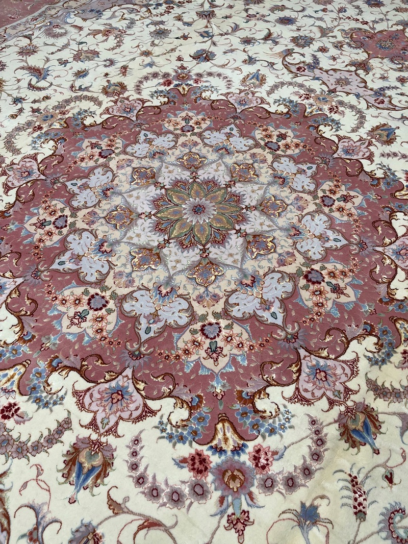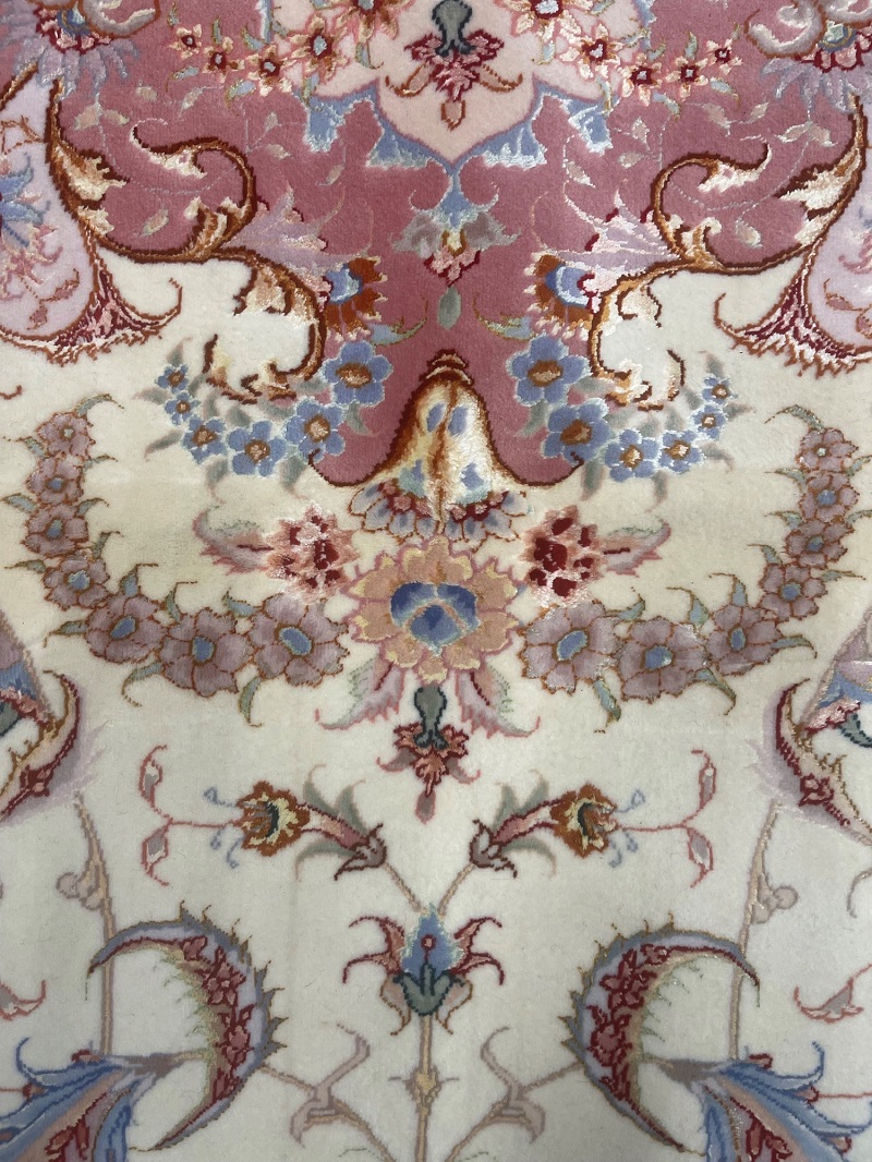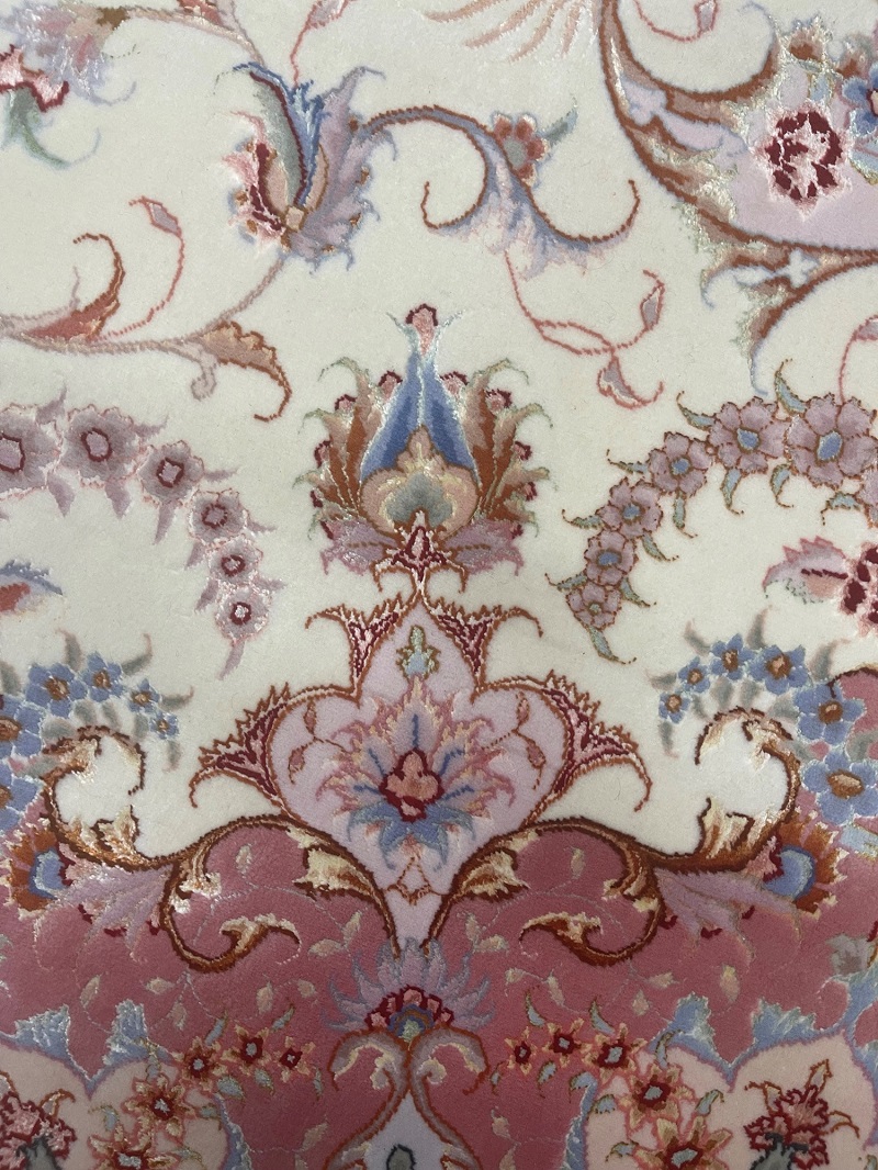 Designed and signed by Master Olia a well-known weaver in Tabriz and Iran. Wool used in rug is Merinos one of the best quality in the world. Silk has a combination of more than 70 colors.