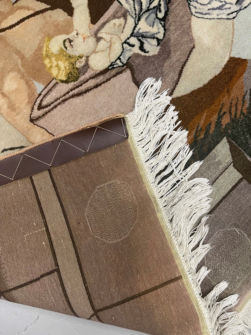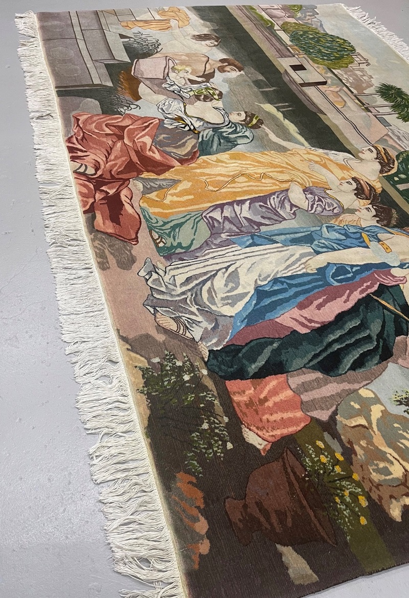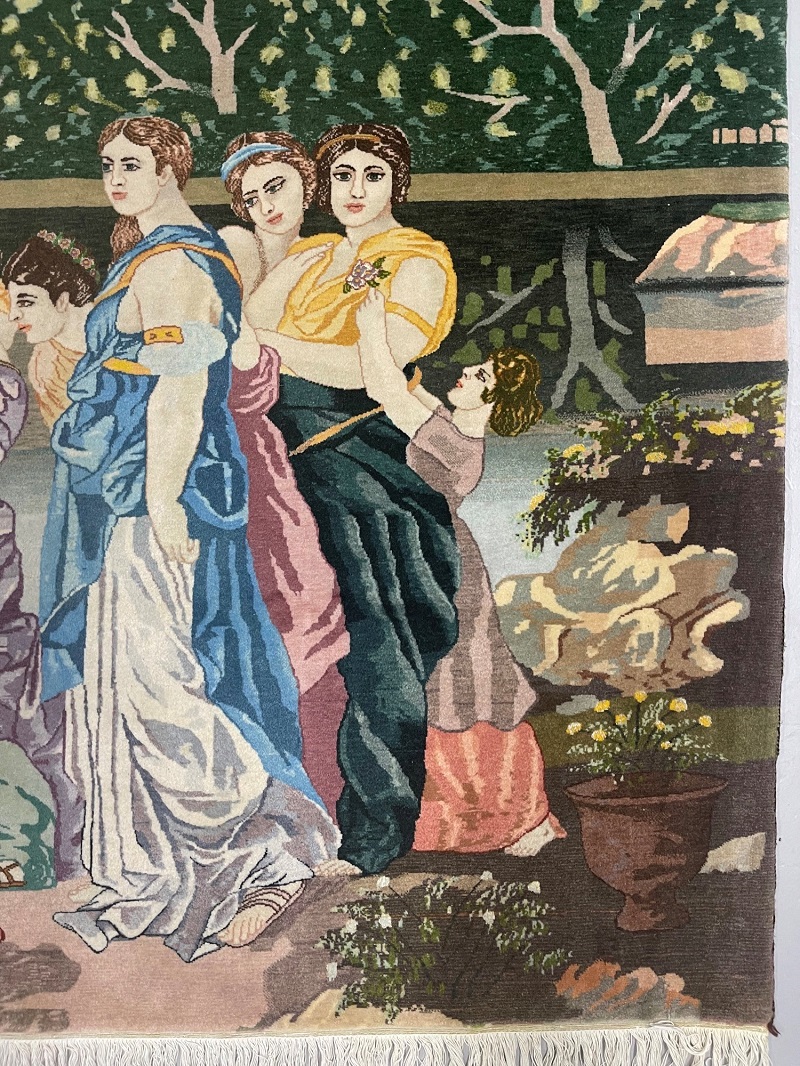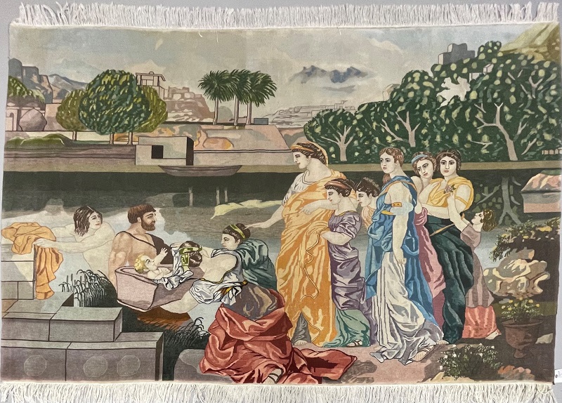 Description: A precious scene of ‘Finding of Moses’ also called ‘Moses Saved from the Waters’, or other names, on a silk and wool rug. The story is in the Hebrew Bible of the finding in the River Nile of Moses as a baby by the daughter of Pharaoh.